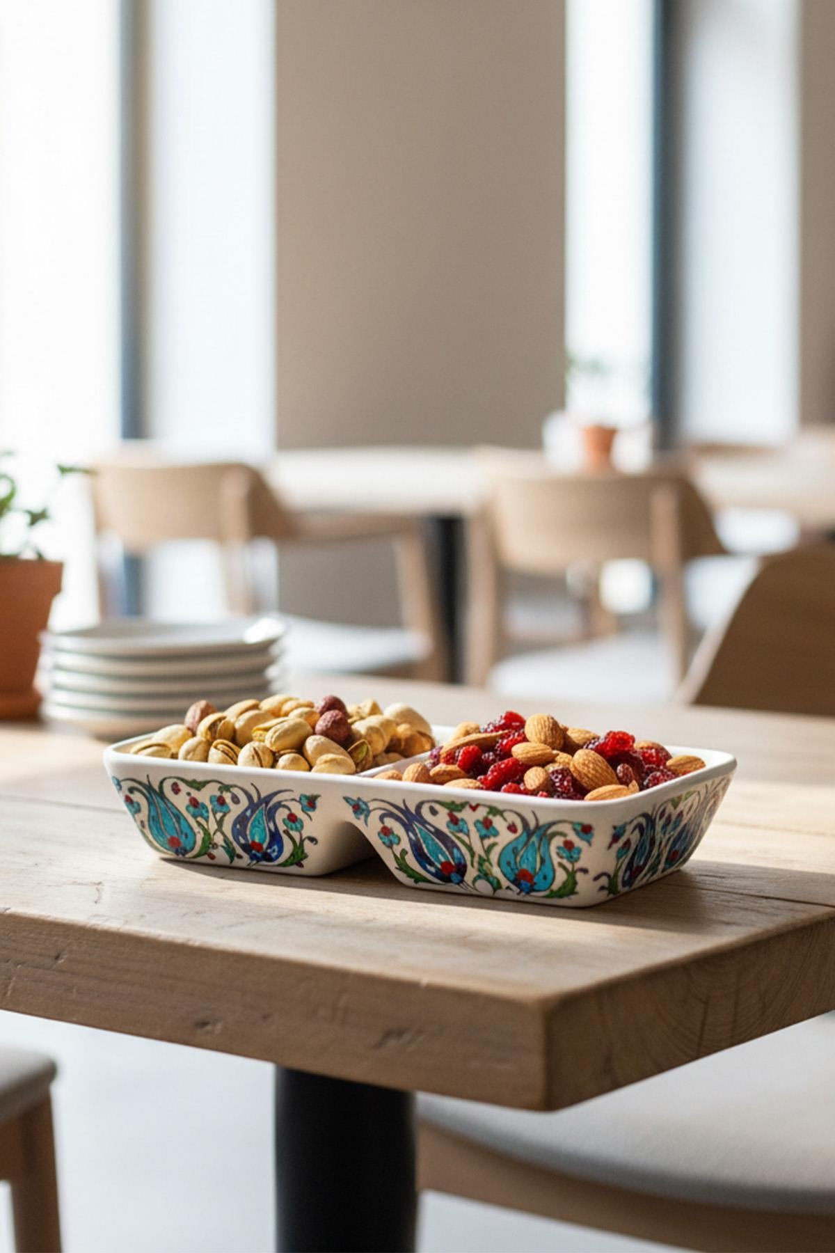 Deze snack schaal heeft een totale afmeting van circa 16,5 x 8,5 cm en een hoogte van ongeveer 3,5 cm. De twee compartimenten hebben een formaat van circa 8,5 x 8 cm per vak. Dankzij deze indeling is de schaal ideaal voor het gescheiden serveren van snacks, dips en bijgerechten.