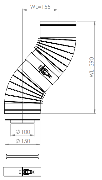Dru concentrische bocht RVS Ø150/100 45°, geribbeld, set a 2 stuks.