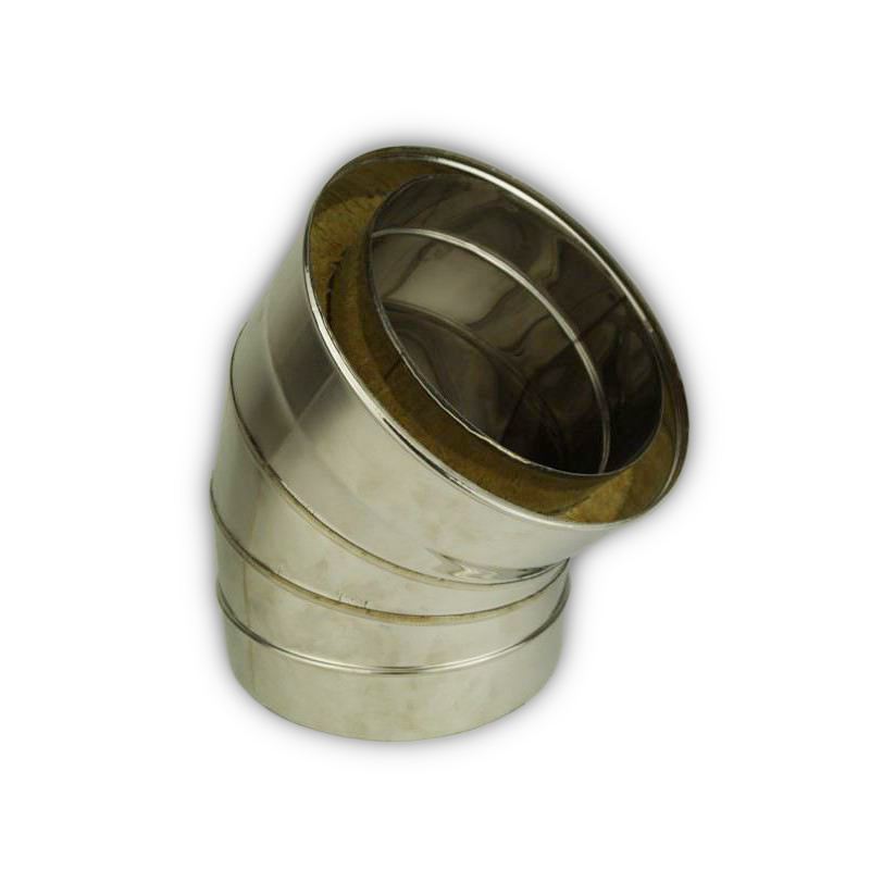 Dubbelwandig geïsoleerd rookkanaal, bocht 45° met 3 segmenten. geschikt voor alle kachels tot een temperatuur van 600°c. Inclusief 1 klemband, exclusief afdichtrubber. Binnen diameter Ø350mm, buitendiameter Ø400mm.