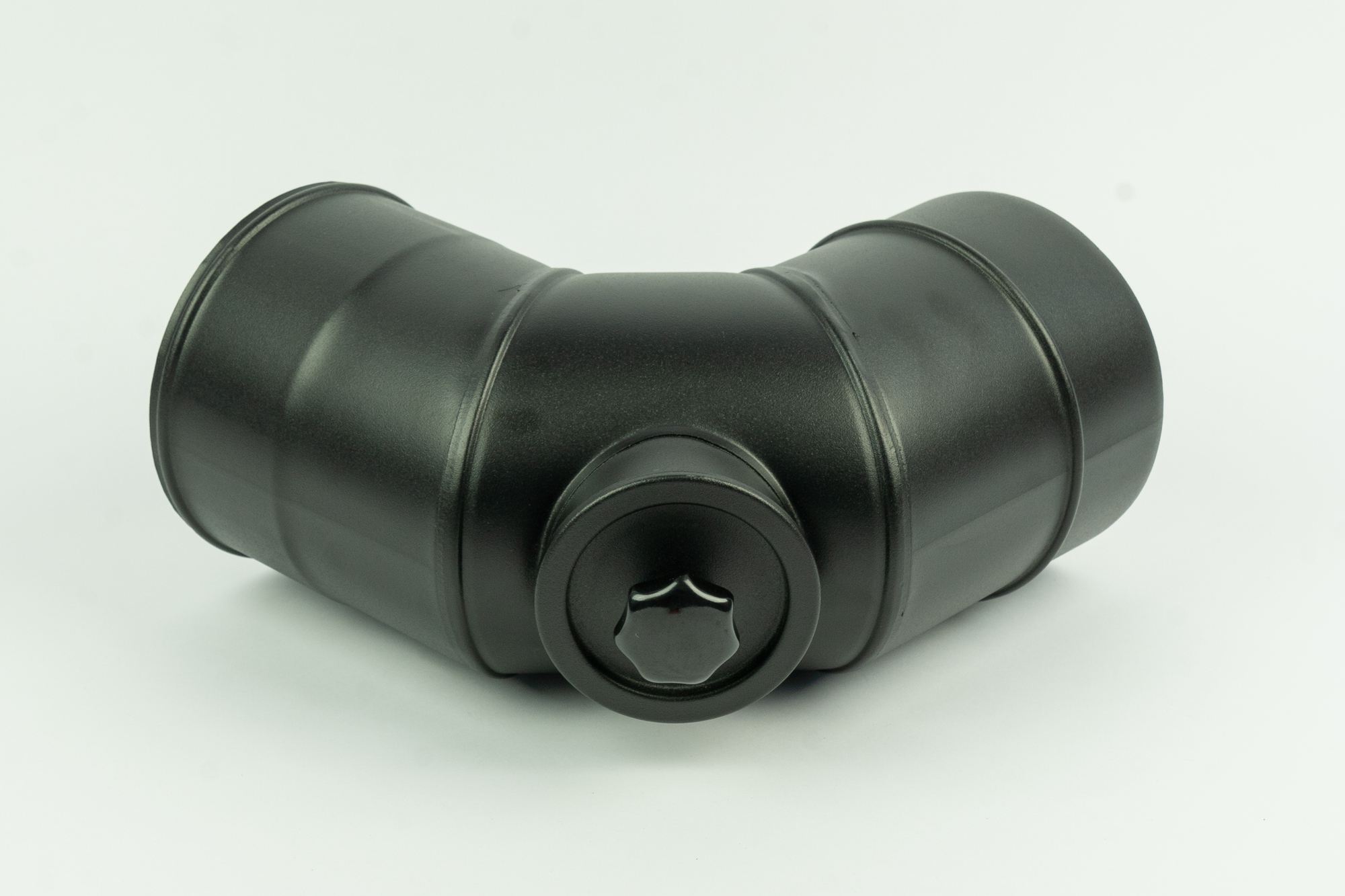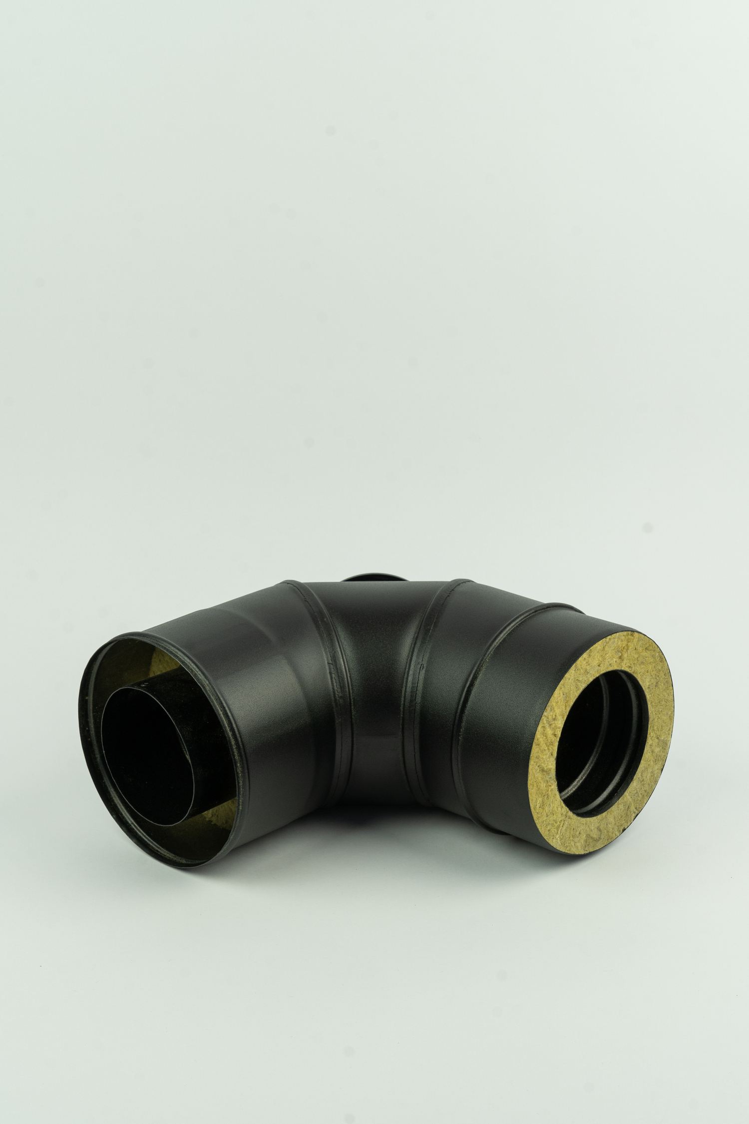 Dubbelwandig geïsoleerd rookkanaal, bocht 45° graden, met inspectiedop, diameter Ø120mm. Geschikt voor temperaturen tot 600° graden. Dop is enkelwandig, bevestigd met een klemband, en eenvoudig te verwijderen.