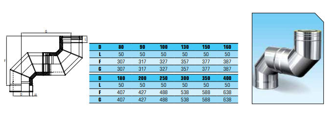 Dubbelwandig rookkanaal RVS, bocht 90° graden, diameter Ø100-150
