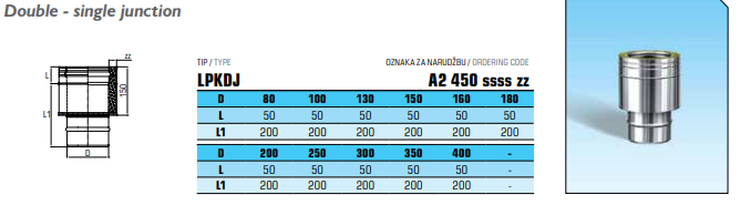 Dubbelwandig geïsoleerd rookkanaal, aansluitstuk dubbelwandig - enkelwandig vrouwelijk, diameter Ø100mm. Voor bevestiging van dubbelwandig kanaal op enkelwandig rookkanaal.