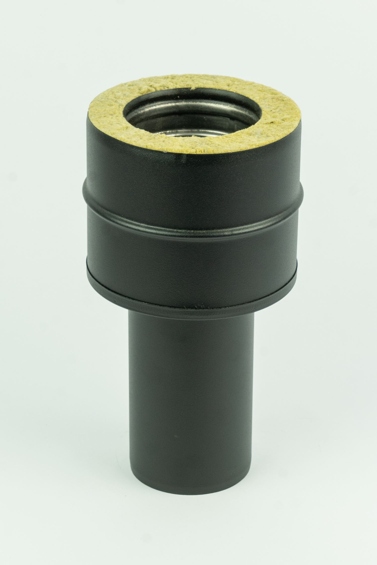 Dubbelwandig geïsoleerd rookkanaal, aansluitstuk dubbelwandig - enkelwandig, diameter Ø120mm. Voor bevestiging van dubbelwandig kanaal op enkelwandig rookkanaal. Enkelwandige zijde is mannelijk uitgevoerd.