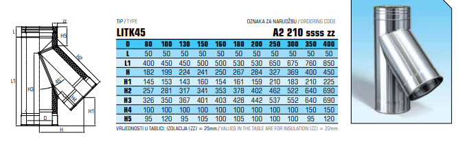 Dubbelwandig geïsoleerd rookkanaal, T-stuk 135° graden, diameter Ø80mm. Geschikt voor temperaturen tot 600° graden.