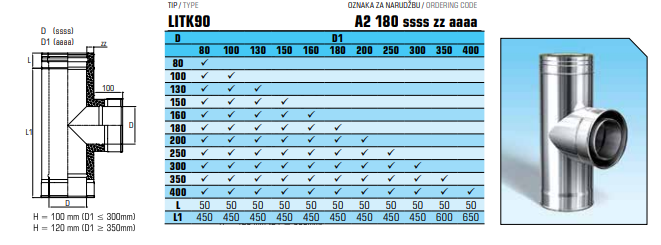Dubbelwandig rookkanaal RVS, T-stuk 90° graden, diameter Ø100-150