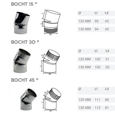 Enkelwandig rookkanaal 125mm met strakke gladde aansluiting 45 graden bocht
