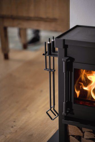 De hangende uitvoering van het Janco de Jong haardstel bestaat uit een tang en pook en kan met een ophangbeugel aan de kachel of aan de muur bevestigt worden. Uniek is de pook, die niet alleen als pook gebruikt kan worden, maar waar je ook doorheen kunt blazen om het vuur aan te wakkeren.