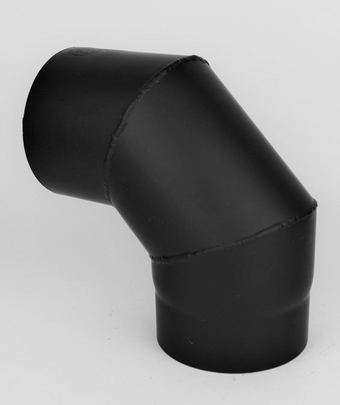 Kachelpijp dikwandig staal, diameter Ø130, 90° bocht, geschikt voor temperaturen tot 600 graden. 2mm dik, zwart. Haakse hoek bestaande uit 3 segment.