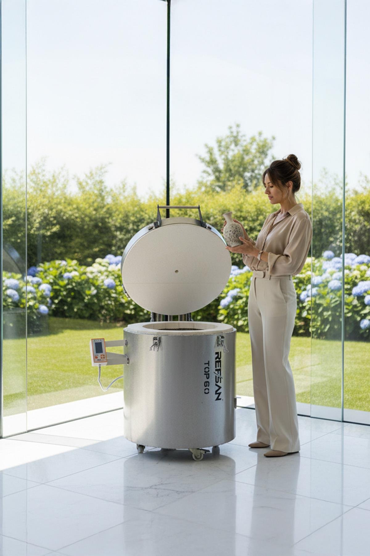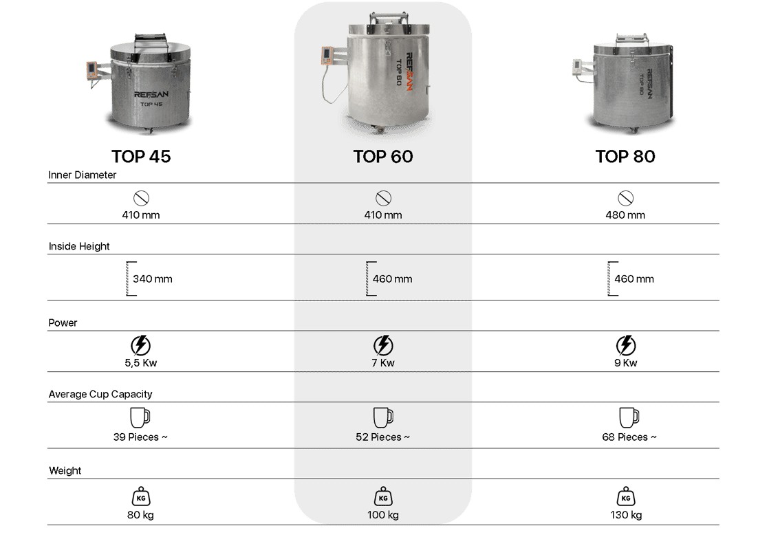 De Refsan TOP 60 Studio is ontworpen voor wie meer ruimte, meer vermogen en meer precisie nodig heeft. Dankzij de combinatie van industriële componenten, digitale besturing en zware isolatie biedt deze keramiekoven betrouwbare prestaties — dag in, dag uit.