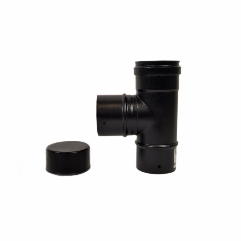 pelletkachel rookkanaal zwart, T-Stuk 90° (mannelijk) + condensatiedop, diameter Ø100mm. Voorzien van siliconen afdichtring. EWZT100